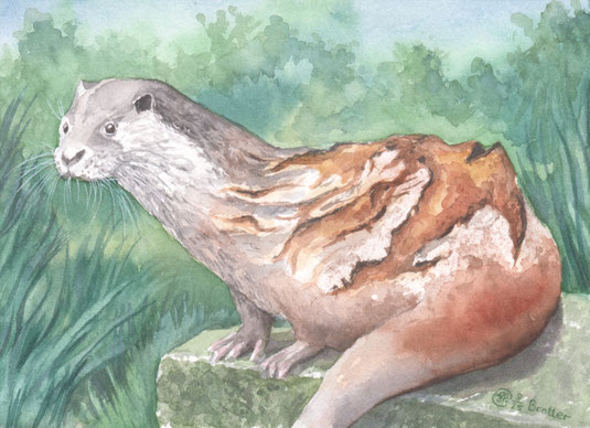 Backwaren habe ich vor Jahren schon einmal aquarelliert, einen Otter aber noch nie. Und schon gar nicht in dieser wilden Kombination. :-) Jedenfalls hat es sehr viel Spaß gemacht und der kleine Brotter hängt nun in guter Gesellschaft neben dem Muffink an der Wand.
